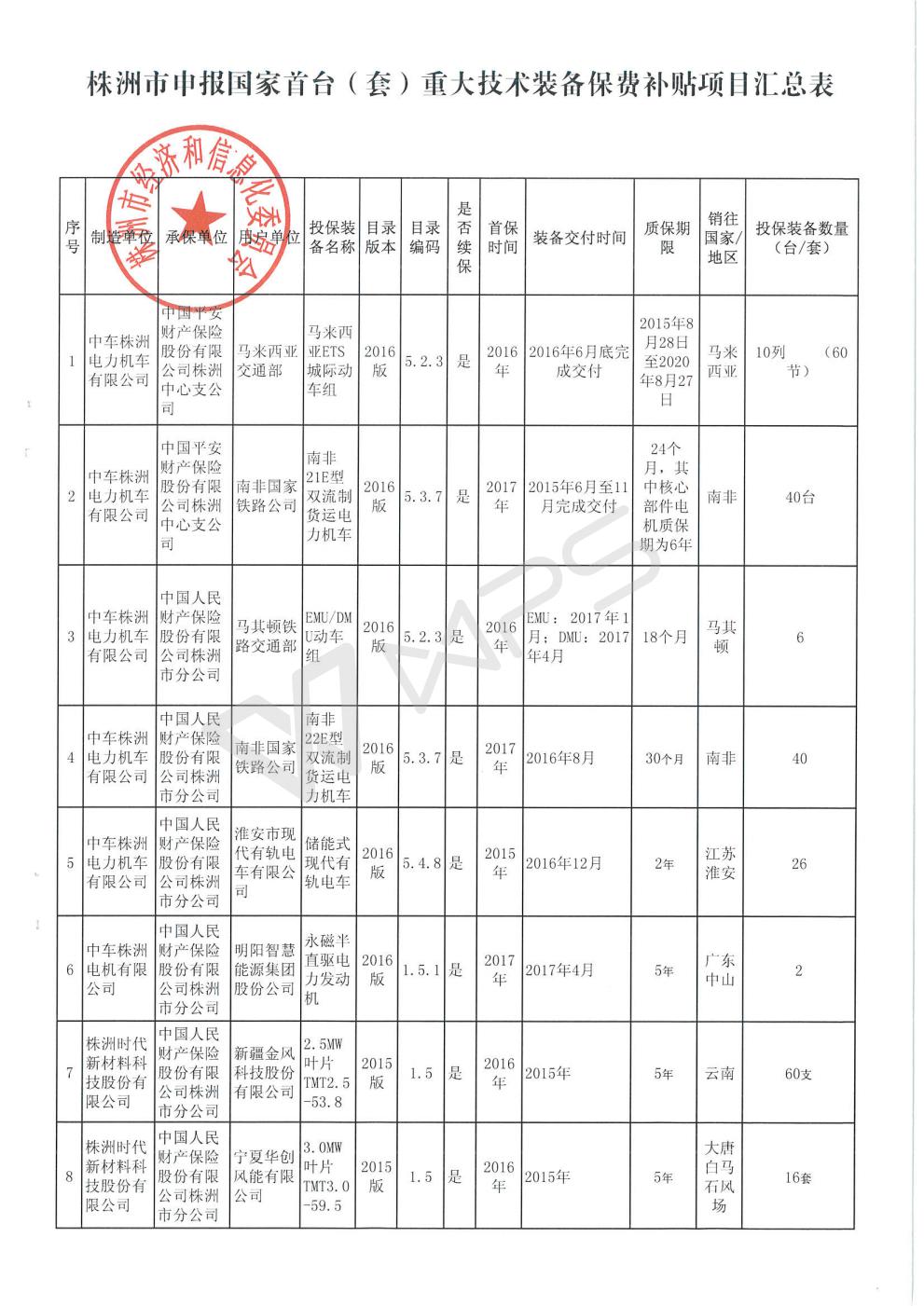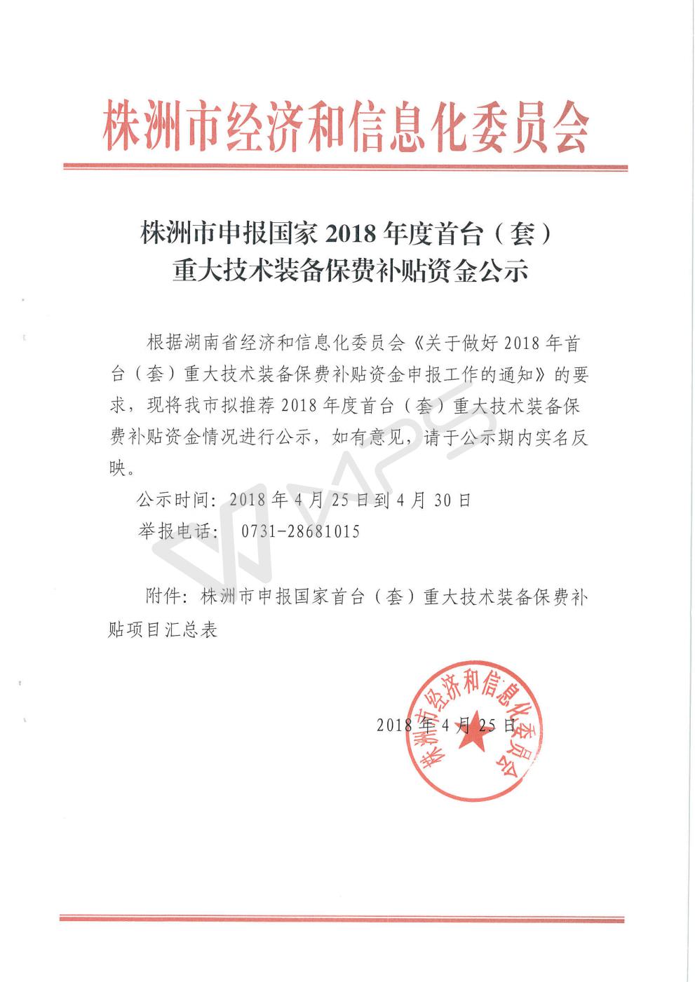 株洲市申报国家2018年度首台(套)重大技术装备保费补贴资金公示